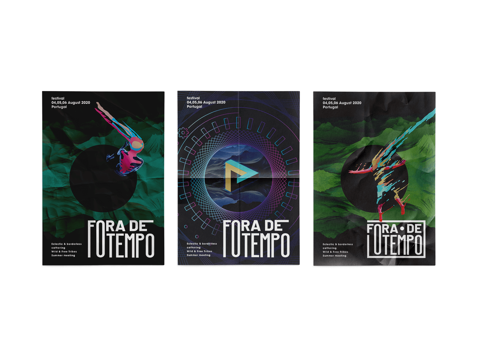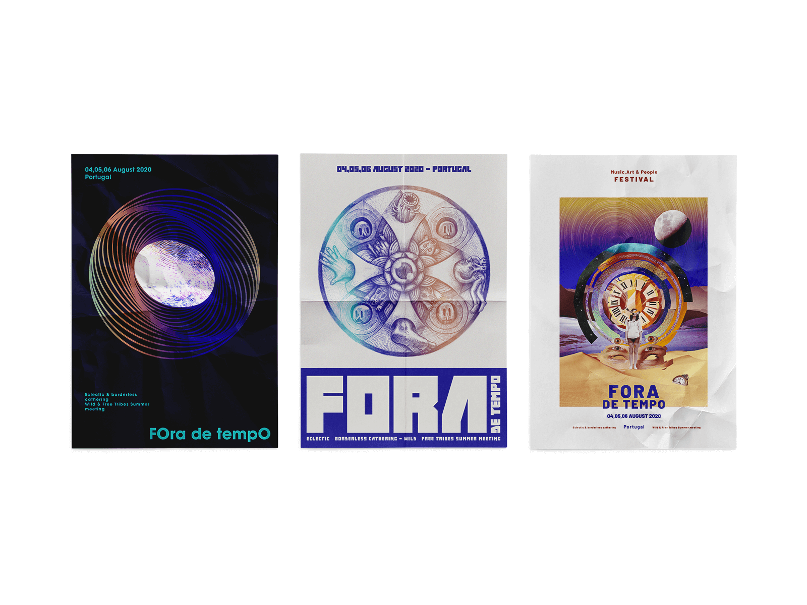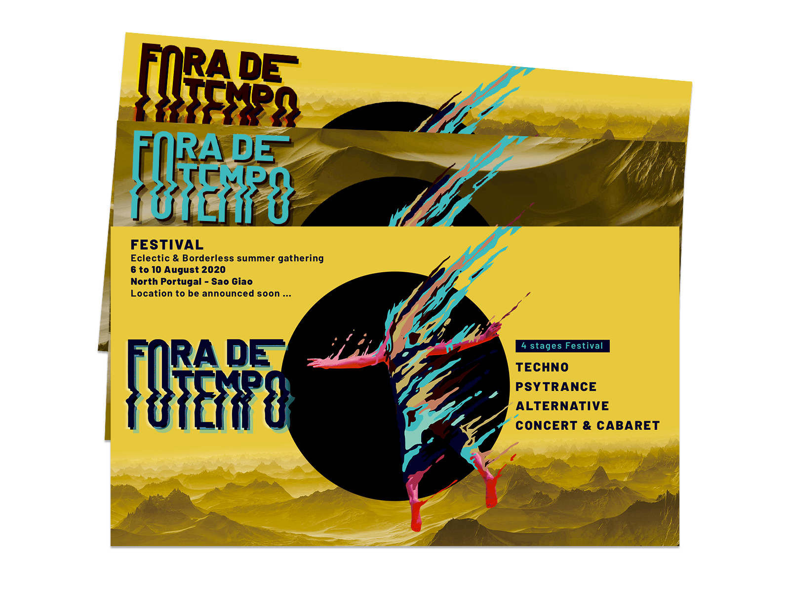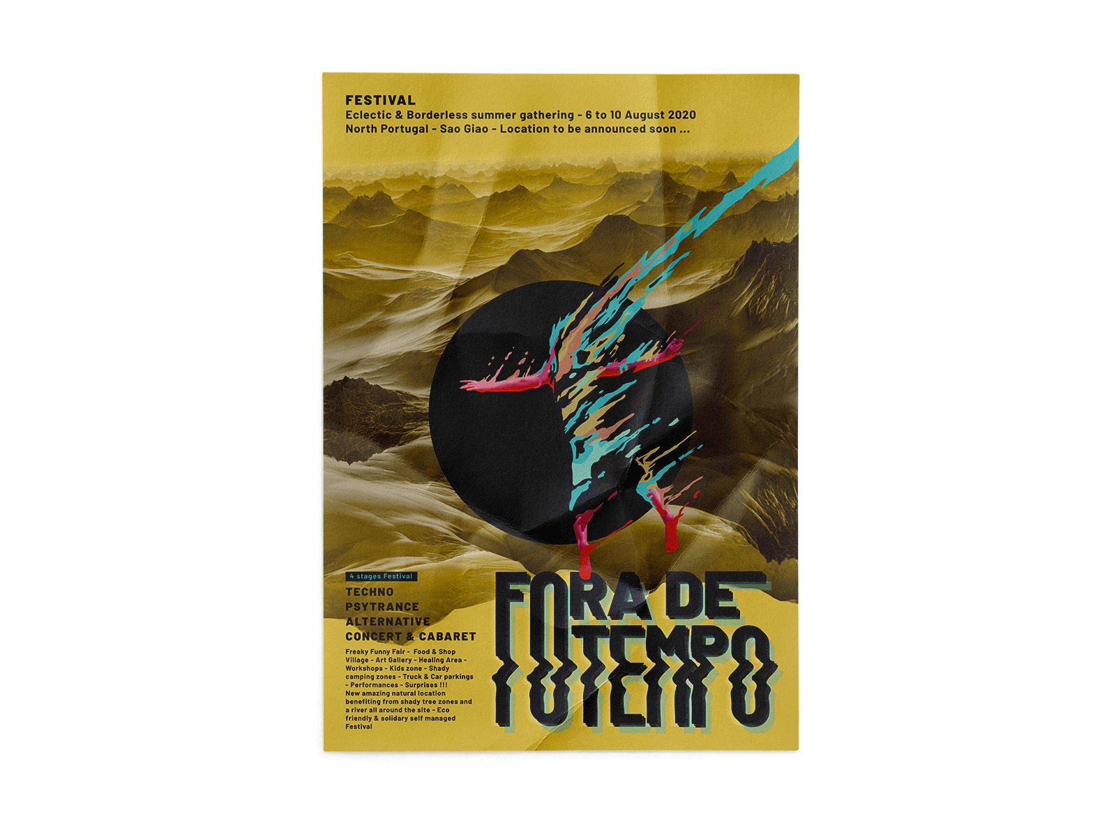 Client : Fora de tempo Festival. Portugal ( 5000 peoples ) Work : Art Direction 360° ( From logo to posters and Motions ) in collaboration with the creative directors of the festival. Production of the whole package communication on social networks. The festival organisation is a complexe conglomerate of french techno crews. Not easy to work with this biotope. Sadly delayed for ever because of COVID crisis...